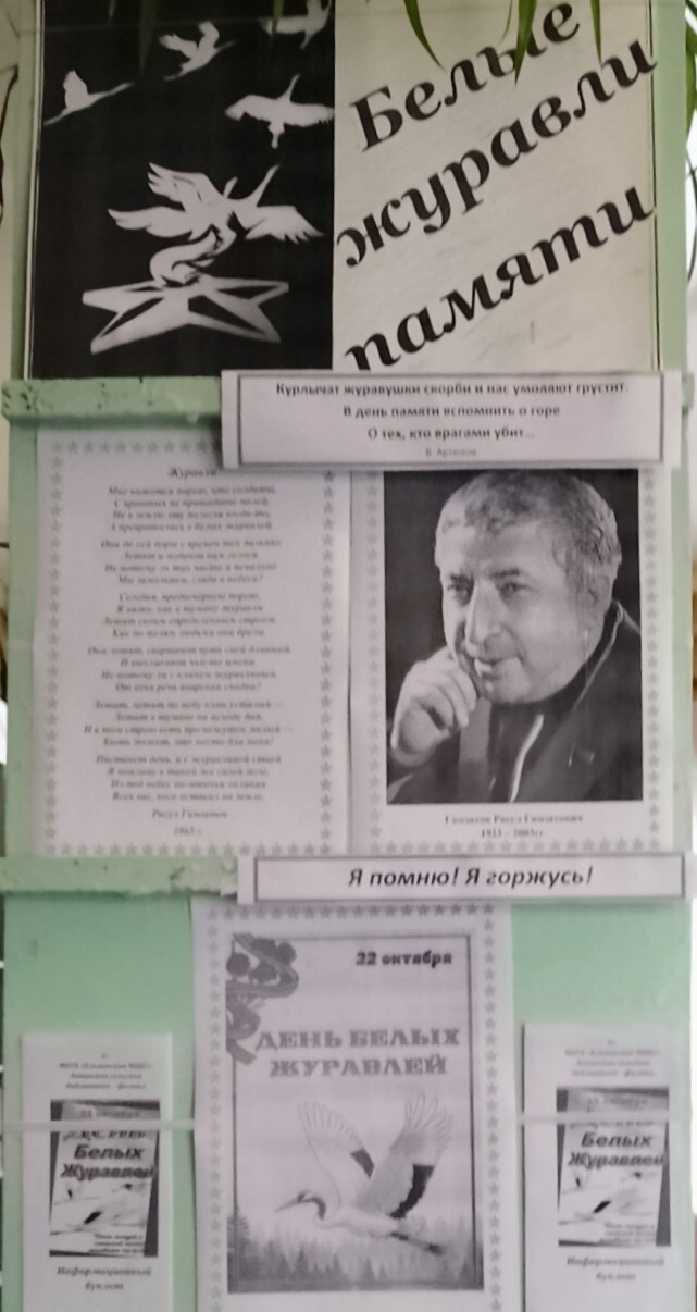 Для данного мероприятия была оформлена выставка «Белые журавли памяти» и проведён библиографический обзор.