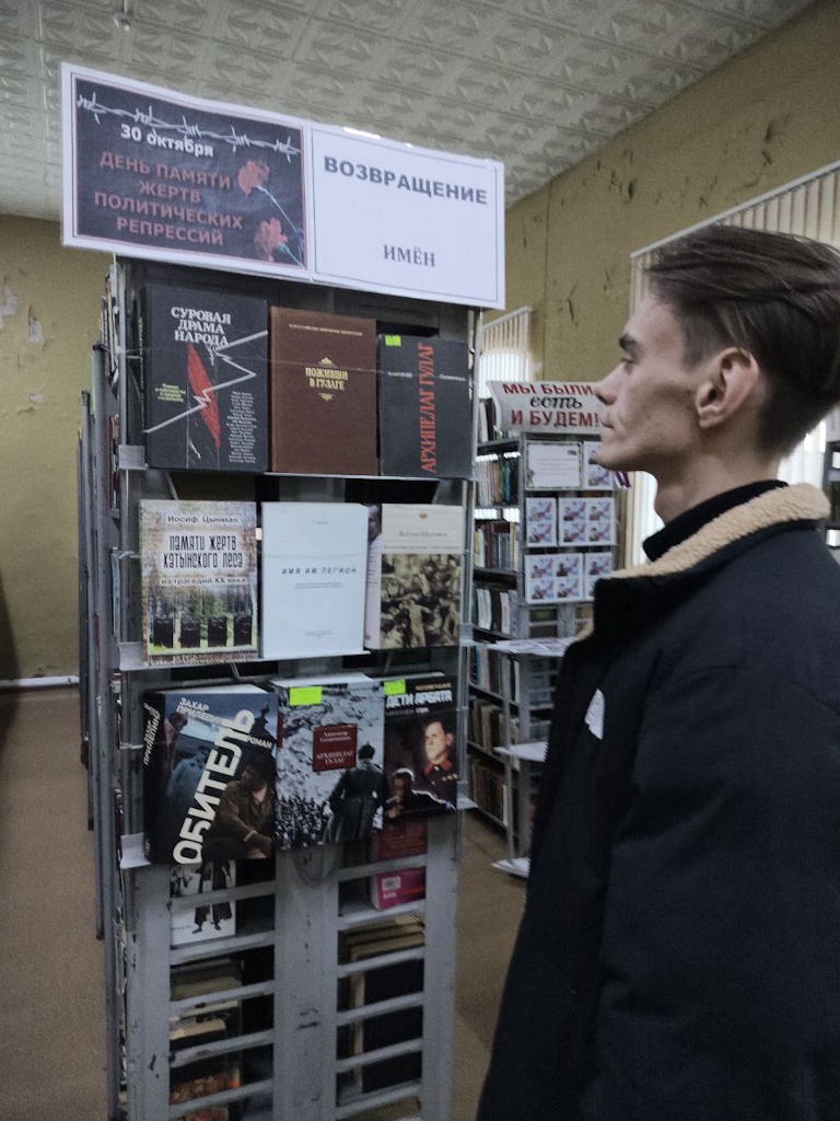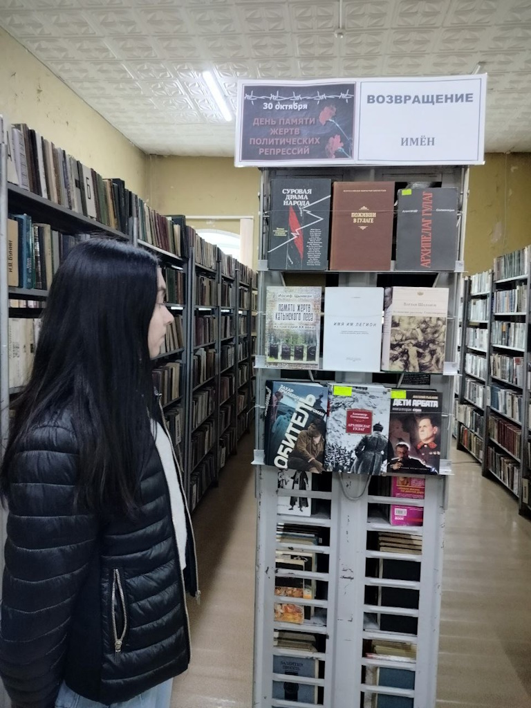 На абонементе в память о жертвах политических репрессий оформлена книжная выставка «Возвращение имен», из представленных книг можно узнать сведения о тяжелом и суровом времени, о годах сталинского культа, о необыкновенной стойкости и преданности своей стране людей, прошедших через репрессии.