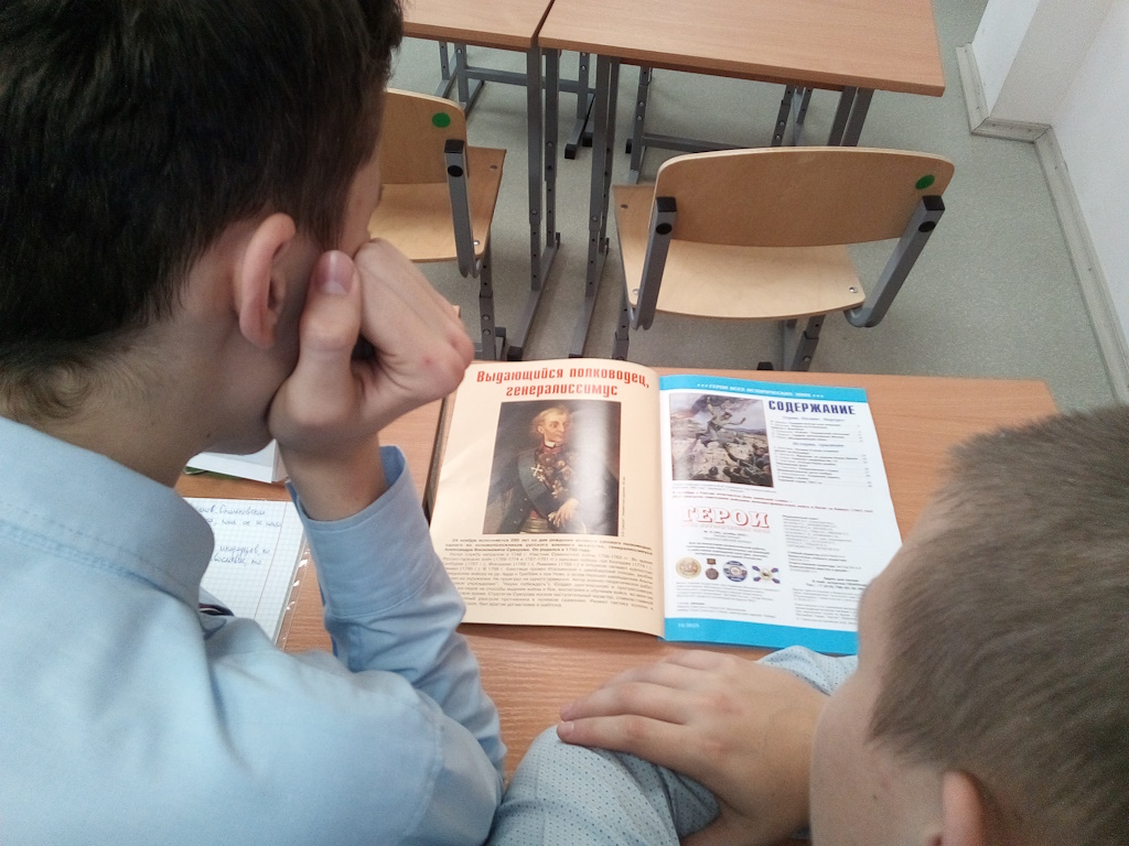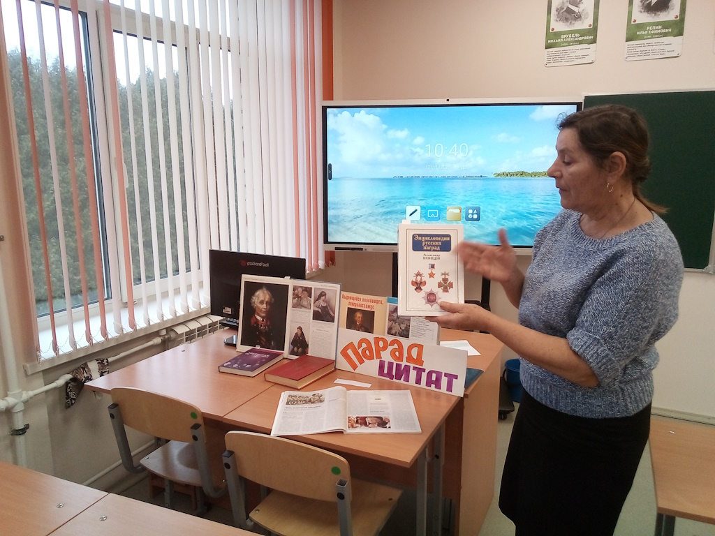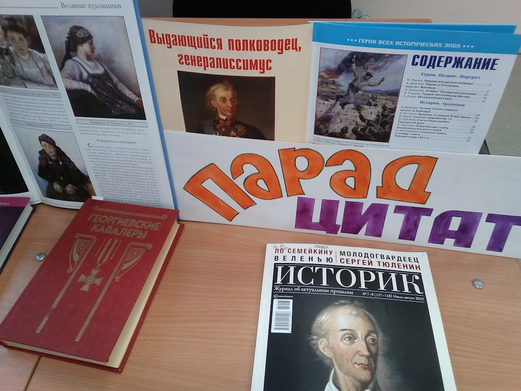 Далее учащиеся зачитывали высказывания Суворова, объясняли смысл цитаты, а библиотекарь помогала присутствующим привести соответствующий пример к сказанному, используя известное литературное произведение, персонаж или реальное событие. Таким образом, под любимую песню Александра Васильевича и его солдат «Солдатушки, бравы ребятушки», цитаты, чтецы и книги стали в парадный строй «под командованием» великого полководца.