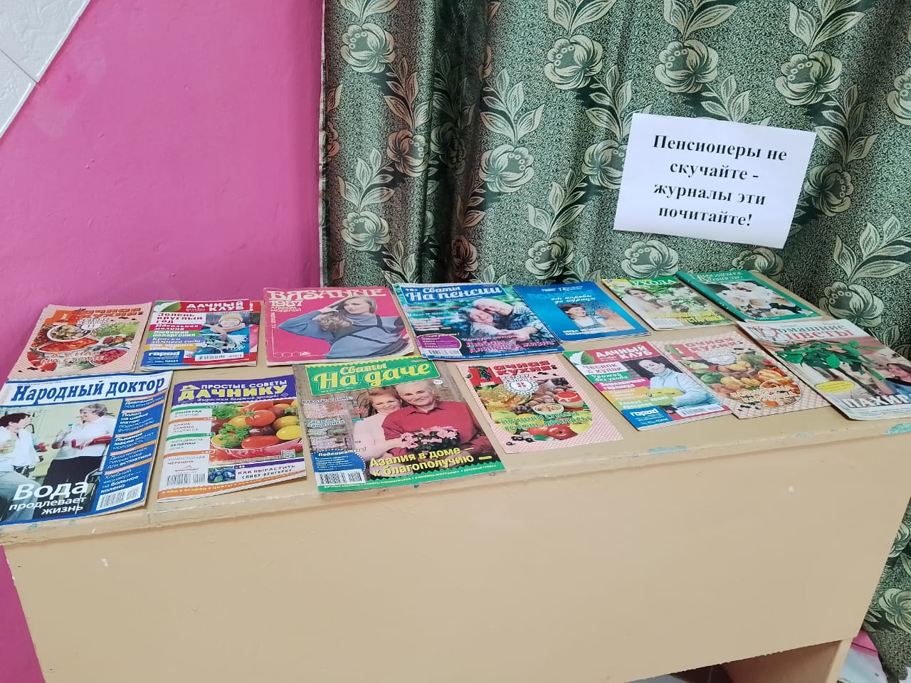 С теплыми поздравлениями к гостям обратились ведущие — библиотекарь Гришутина Г.Л. и Мишанкова С.В. Библиотекарь рассказала присутствующим об истории праздника. Так же была подготовлена выставка периодических изданий «Пенсионеры не скучайте — журналы эти почитайте!».